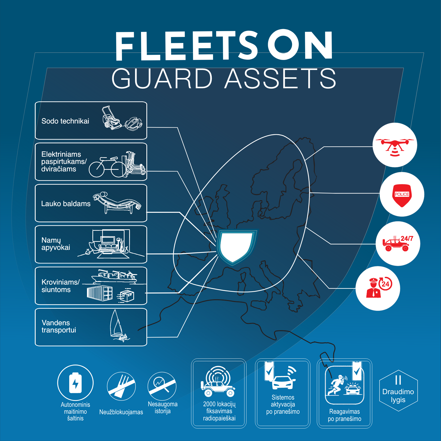 FleetsOn Guard apsaugos sistemos sujungia pažangią radijo vietos nustatymo technologiją su GPS ir GSM ryšiu, papildytą aktyvios apsaugos sprendimais. Šis hibridinis sprendimas leidžia itin tiksliai nustatyti objekto buvimo vietą net sudėtingomis sąlygomis – pavyzdžiui, požeminiuose garažuose ar jūriniuose konteineriuose.